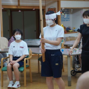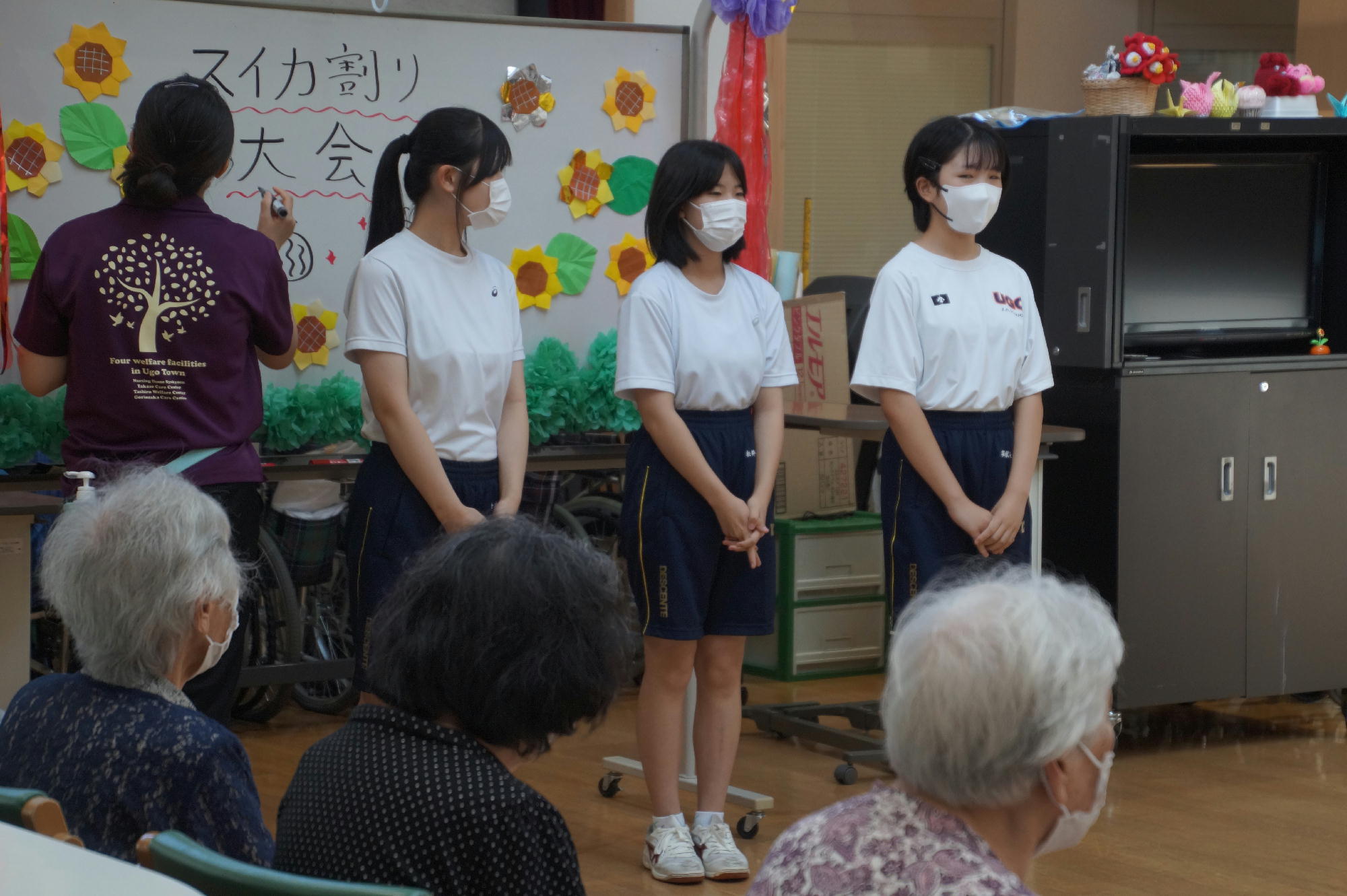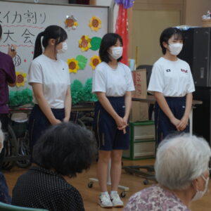 ①体験提供事業所「社会福祉法人羽後町社会福祉協議会」 ②体 験 日 令和6年8月9日(金) ③体験場所 五輪坂デイサービスセンター ④体験内容 ・一緒に体操 ・レクリエーション体験(スイカ割り大会) ⑤参 加 者 中学2年生3名参加